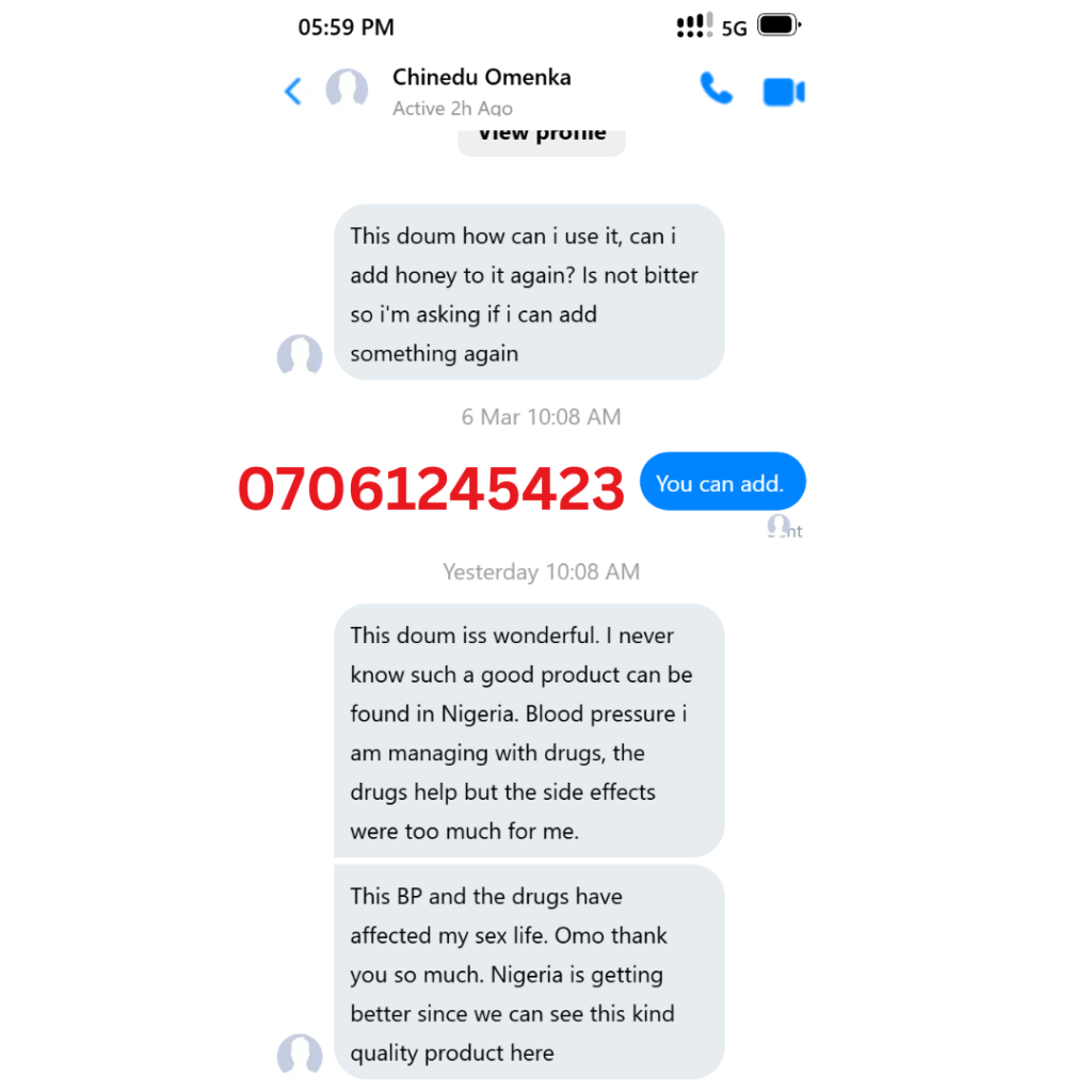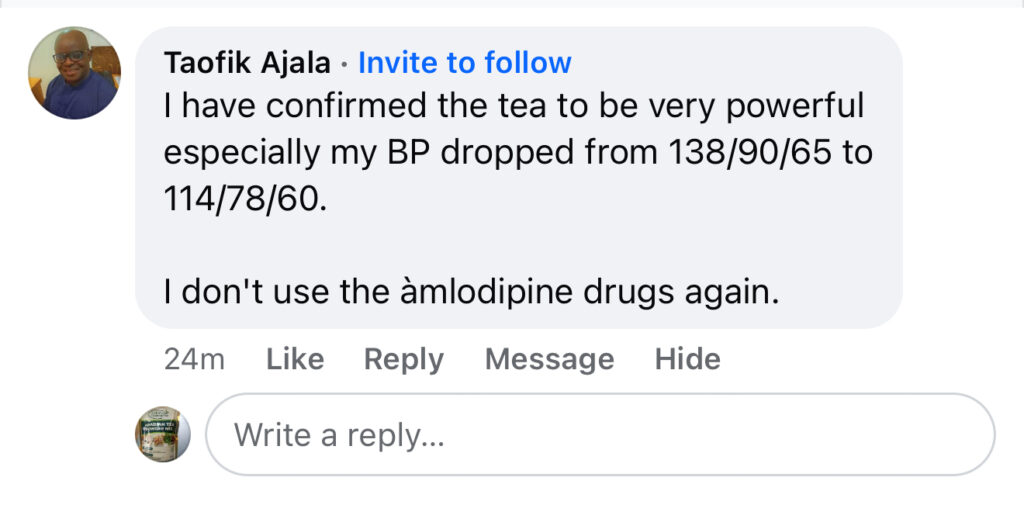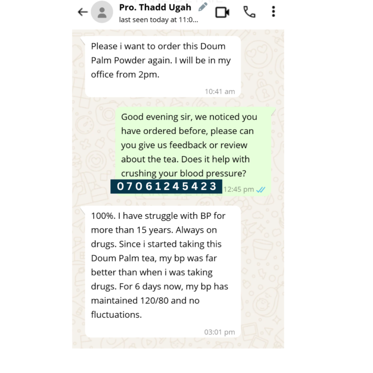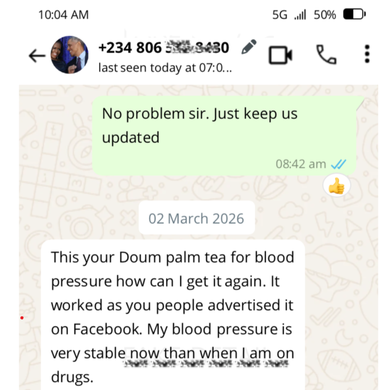 “He has confirmed Doum Palm Tea to be powerful in his BP. He even stopped taking medicine. If you’re tired of taking medicine and want something as powerful as the medicine without any side effects that medicine, give, get this doum”
